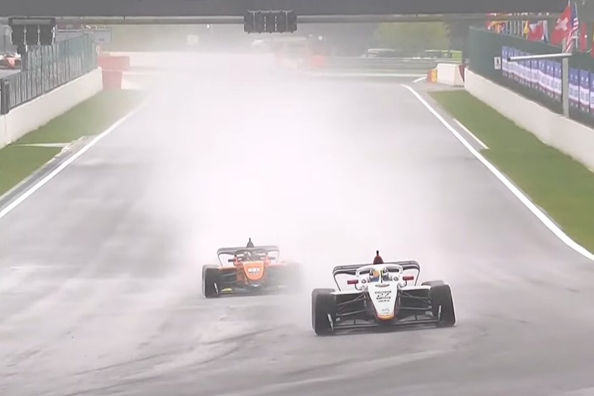 The rain had extended to sector one by lap six, and Palou’s Alceu Feldmann Neto had a scary spin at Eau Rouge while Carrasquedo had to defend his lead and several drivers had offs. Race control put the race under safety car conditions later in the lap, and Feldman was among four drivers to pit for more suitable rubber.