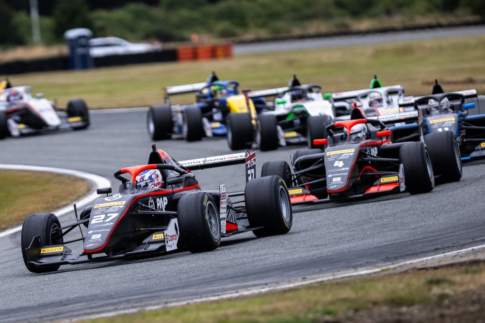 Jack Taylor (Giles) had taken fifth from Cooper Shipman (Kiwi) with a great move around the outside of turn one on lap nine, while MTEC’s Ryan Wood held seventh at that point. The attacks of Fionn McLaughlin on him instead made the Hitech driver vulnerable to Ugochukwu, and they were at a fighting stalemate until Ugochukwu overtook McLaughlin on lap 14.